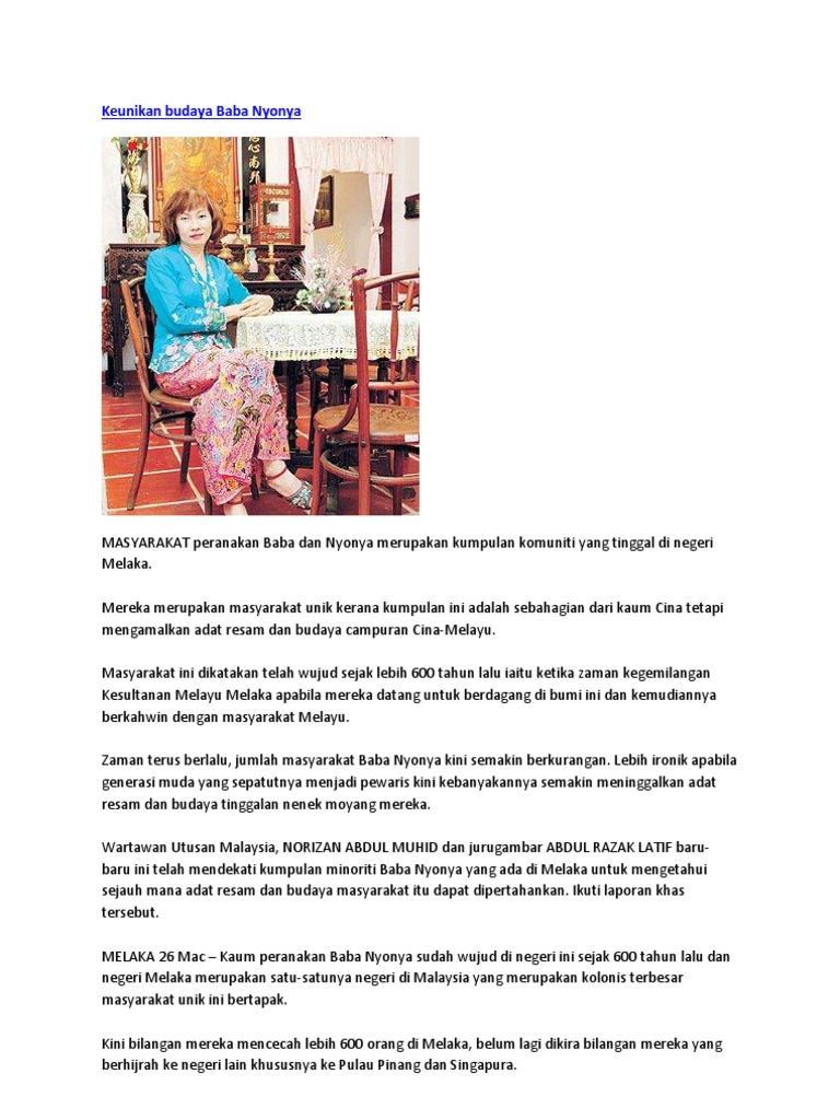 Keunikan Masyarakat Baba Nyonya Di Melaka Peranakan Baba Dan Nyonya Merupakan Kumpulan Komuniti Yang Tinggal Di Negeri Melaka Mereka Merupakan Masyarakat Unik Kerana Kumpulan Ini Adalah Sebahagian Dari Kaum Cina Tetapi Mengamalkan